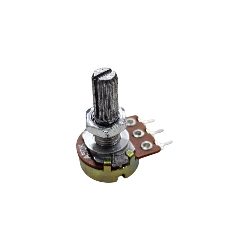 Este é um Potenciômetro Logarítmico (Curva A) de 50 k, destinado a ser usado principalmente como controle de volume em equipamentos de áudio ou onde uma variação de resistência não linear é desejada. O formato é de três terminais e possui um eixo com 20mm de comprimento.