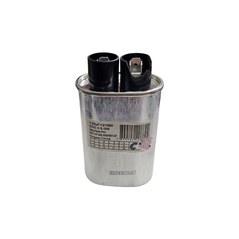Capacitor Para Micro-Ondas 1.00uF x 2100Vac 50/60Hz 5.5.008 CH8521100", é um capacitor de alta tensão para forno micro-ondas. Vamos detalhar as especificações: