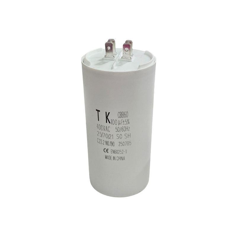 O Capacitor de Polipropileno 100uF x 400V 50/60Hz Plástico Faston CBB60 TK é um capacitor de motor de filme de polipropileno metalizado, projetado para uso contínuo em motores monofásicos. Ele pertence à mesma família de capacitores do tipo CBB60, mas se diferencia pelo seu dielétrico e pelas suas especificações de tensão e capacitância, que o tornam adequado para aplicações de maior potência.