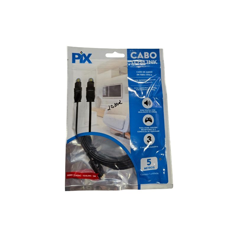 Cabo Toslink de Áudio Digital Óptico, com 5 metros de comprimento, na cor preta, da marca Pix.