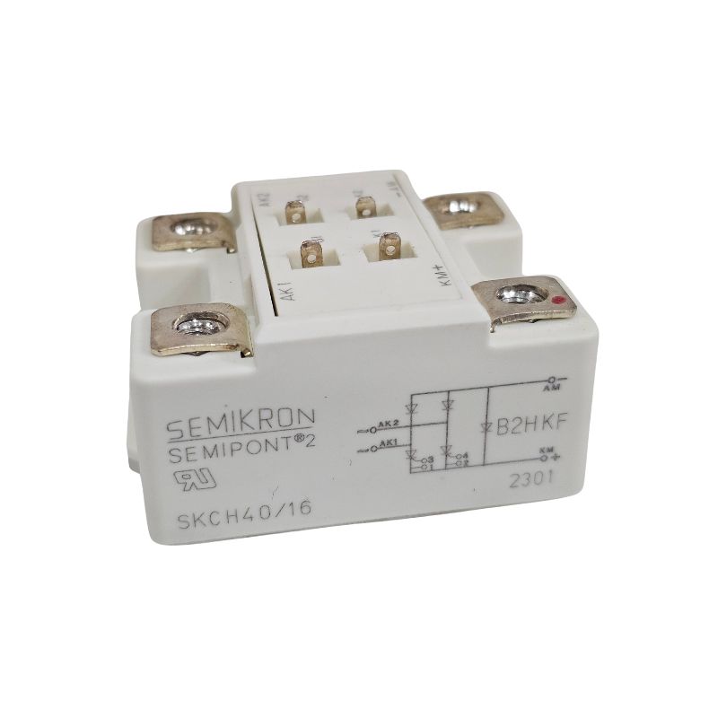 A SKCH40/16 da Semikron é uma ponte retificadora de alta performance, projetada para aplicações industriais que exigem retificação confiável de corrente alternada (AC) para corrente contínua (DC). Este módulo utiliza tecnologia de montagem em encapsulamento compacto e robusto, garantindo excelente dissipação térmica e alta durabilidade mesmo em condições severas de operação.