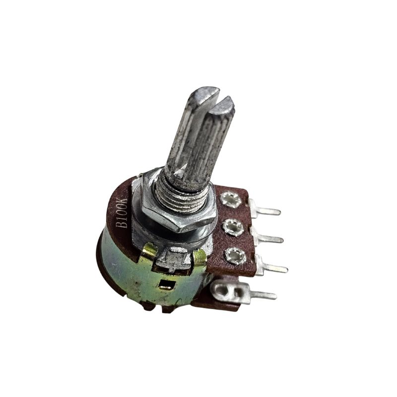 Essencialmente, o componente funciona como dois potenciômetros de 100K B, um ao lado do outro, em uma única estrutura. Ao girar o eixo, os cursores de ambos os potenciômetros se movem em sincronia, variando as resistências dos dois circuitos de forma idêntica. A presença de seis terminais (três para cada potenciômetro) facilita a conexão e a diferenciação de cada canal.