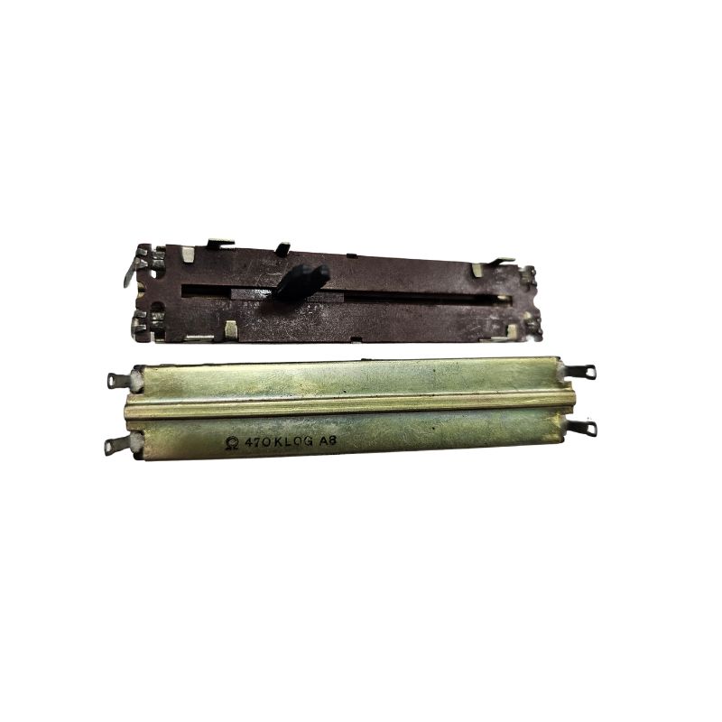 É um potenciômetro deslizante de 470K ohm com taper logarítmico, ideal para aplicações de áudio profissional, especialmente em mesas de mixagem e equalizadores.