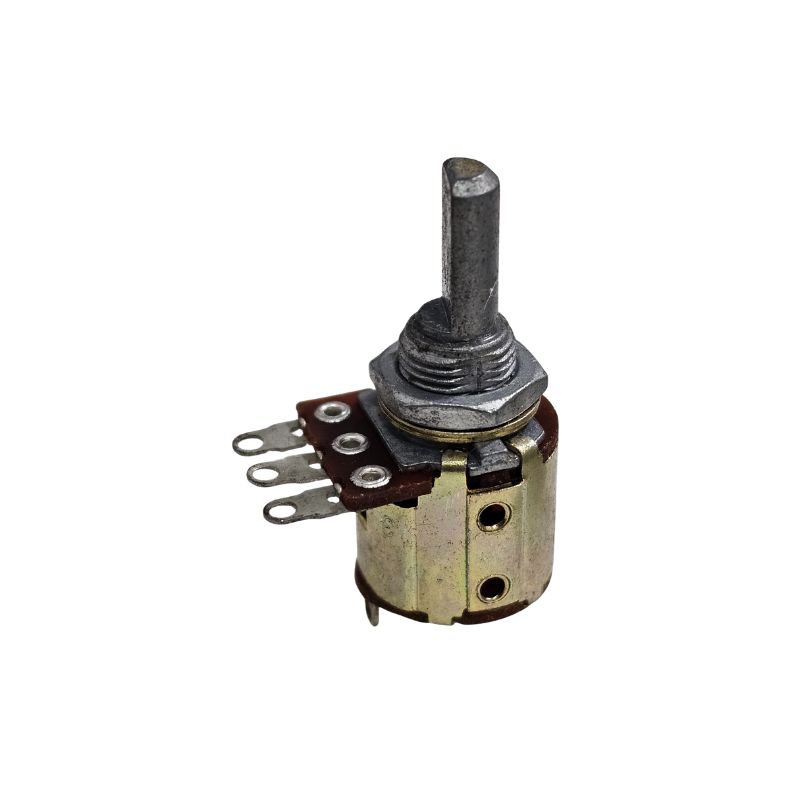 Com Chave: Uma chave rotativa está embutida no corpo do potenciômetro. Ela é ativada em uma das extremidades do curso, geralmente no início (totalmente no sentido anti-horário). Essa função é ideal para combinar o controle de volume com a função de liga/desliga em um único componente.