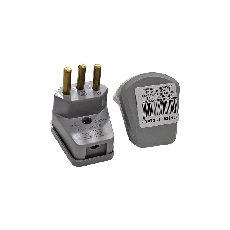 Tomada Pino Gigante Macico New 90 20A 250V 3 Pinos Cinza", é um Plugue Macho (o lado que vai na tomada) para ser acoplado a um cabo.